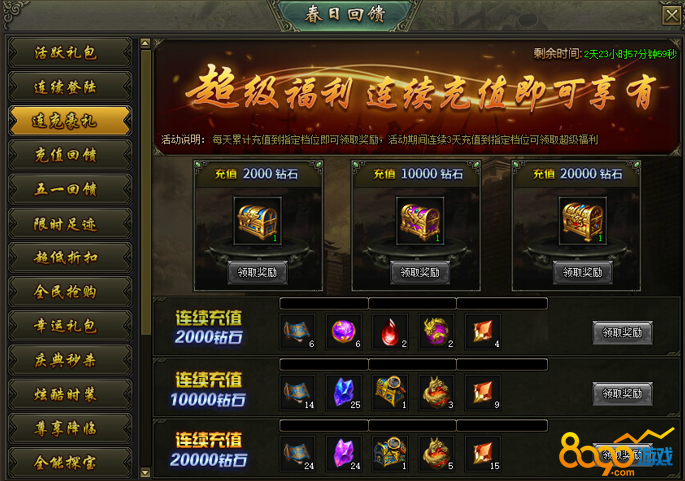 活动说明:活动期间,每天累计充值到指定档位即可领取对应奖励,连续充值3天可领取连充大奖