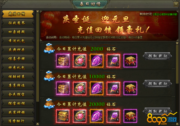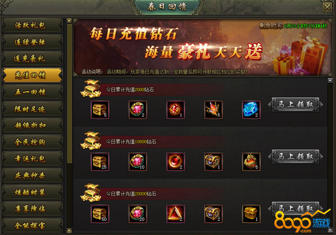 活动说明:活动期间,每天累计充值到指定档位即可领取对应奖励
