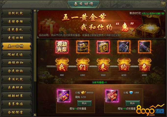 活动说明:活动期间,购买节日礼包可获得祝福值,祝福值达到指定额度可领取对应奖励