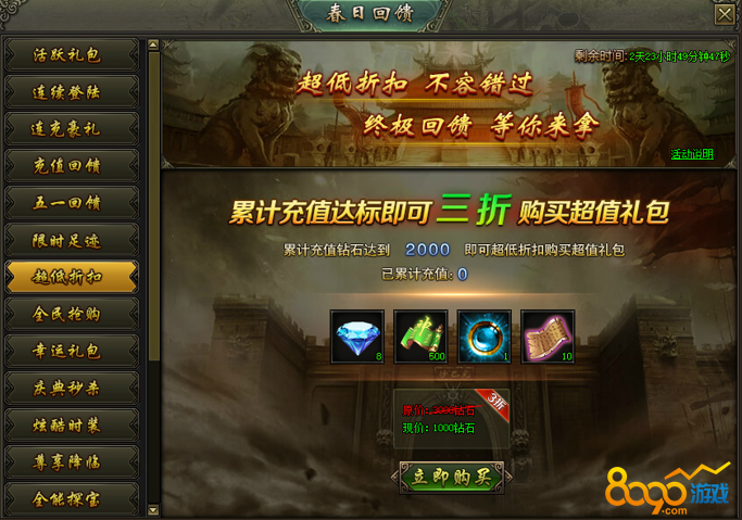 活动说明:活动期间,累计充值达到指定额度,即可购买超低折扣礼包