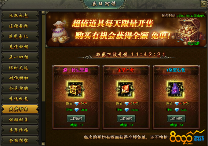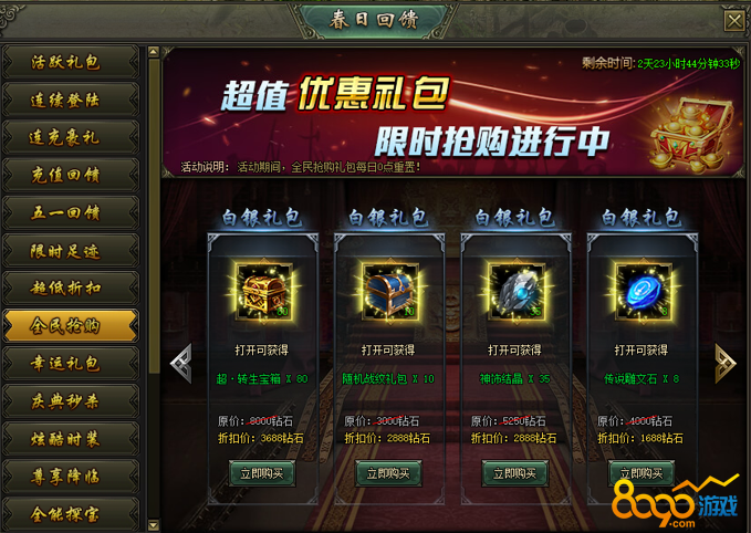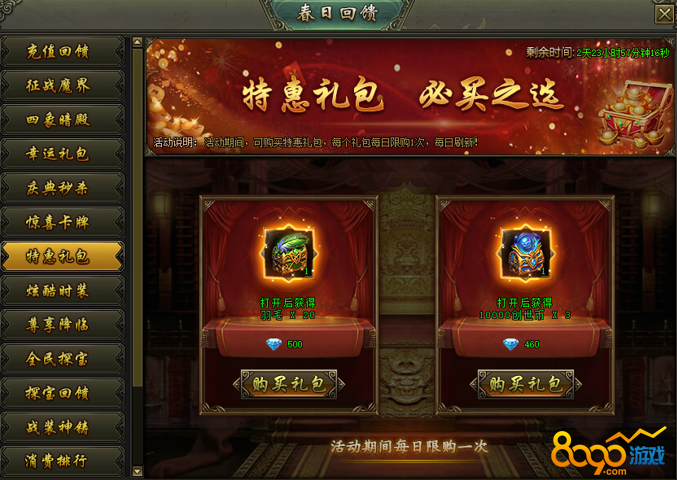 活动说明:活动期间,可购买特惠礼包,每个礼包每日限购1次