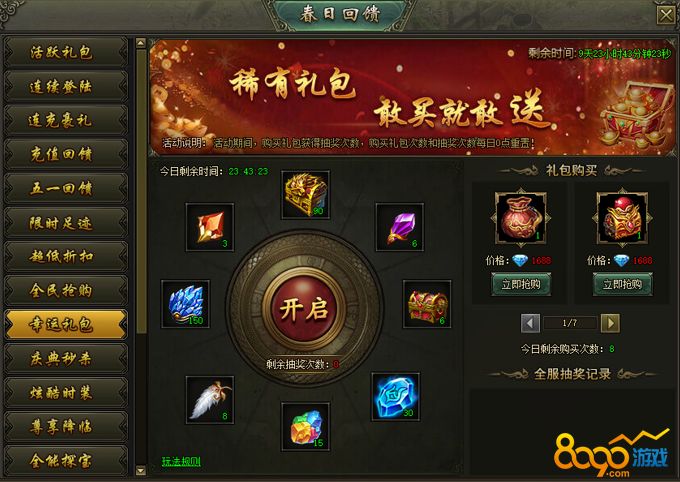 活动说明:活动期间,购买礼包获得抽奖次数,购买礼包次数和抽奖次数每日0点重置。