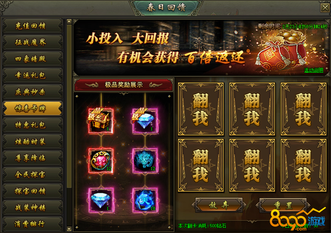 活动说明:活动期间,消耗钻石开启卡牌可获得超级奖励,更有几率翻到超级大奖