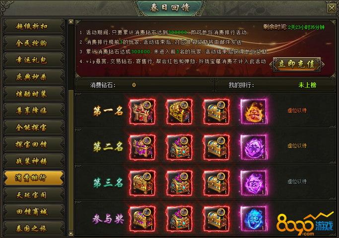 活动说明:活动期间,累计消费达到100000钻石的玩家参与排行,达到对应档位的玩家奖励在活动结束后以邮件的方式进行发放