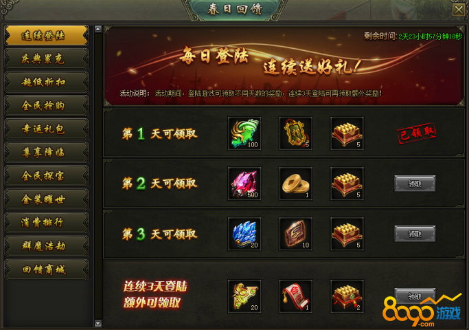 活动说明:活动期间,登陆游戏可领取不同天数的奖励,连续3天登陆可再领取额外奖励