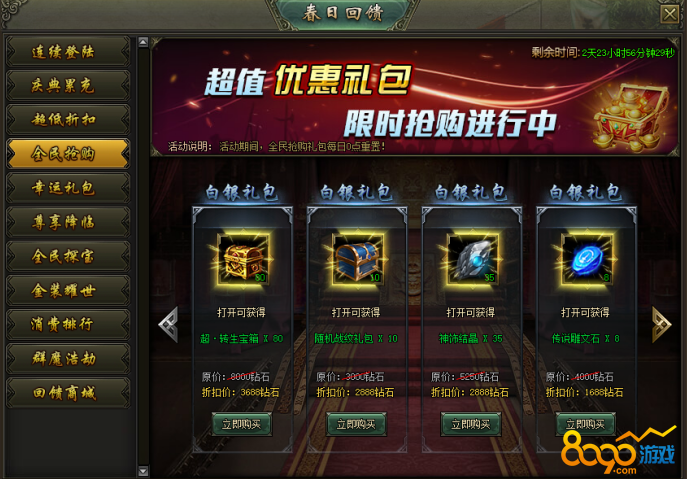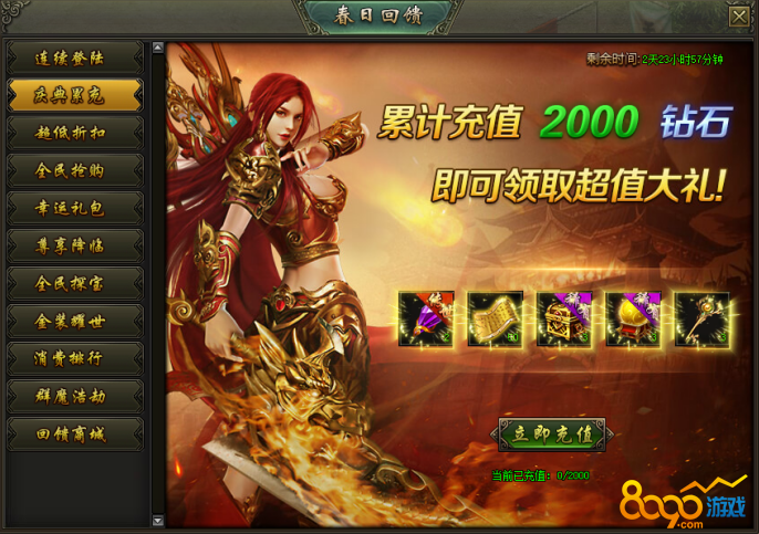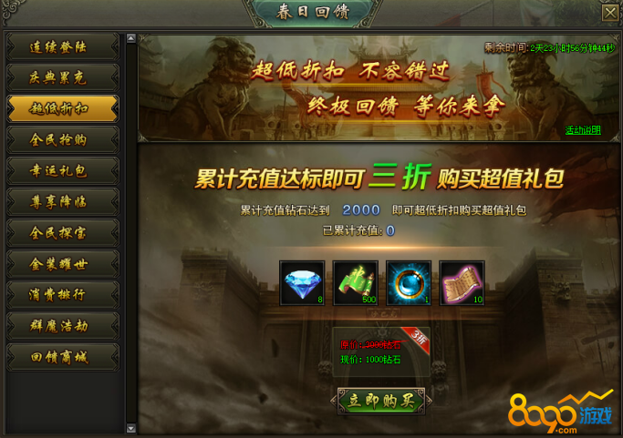 活动说明:活动期间,累计充值一定钻石即可超低折扣购买礼包