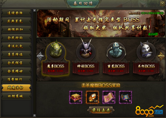 活动说明:活动期间,累计击杀指定类型BOSS,可领取超值奖励!