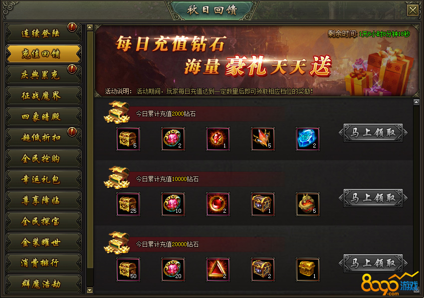 活动说明:活动期间,每日充值达到指定额度,即可领取超值豪礼,每种档位可领取1次