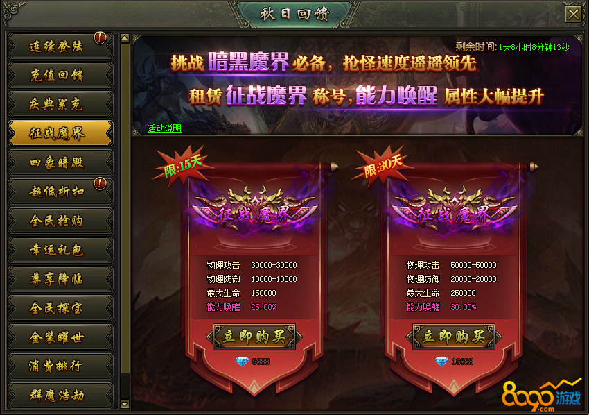 活动说明:活动期间限时租赁征战魔界称号,能力唤醒属性大幅提升
