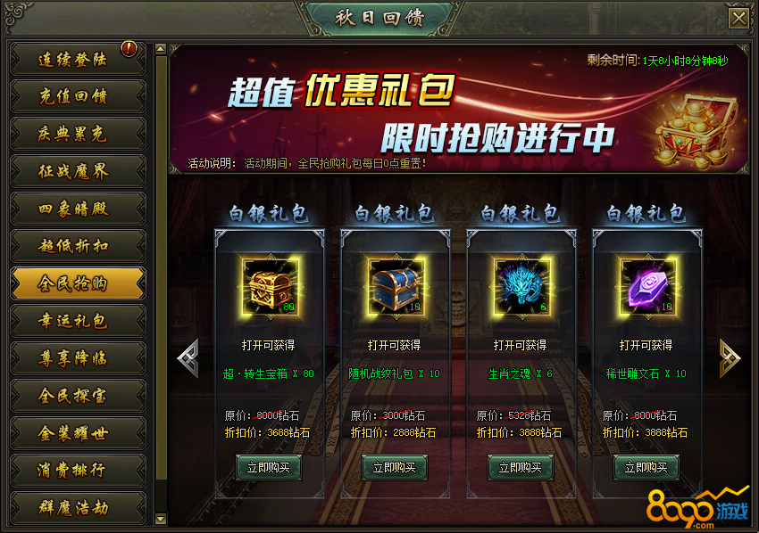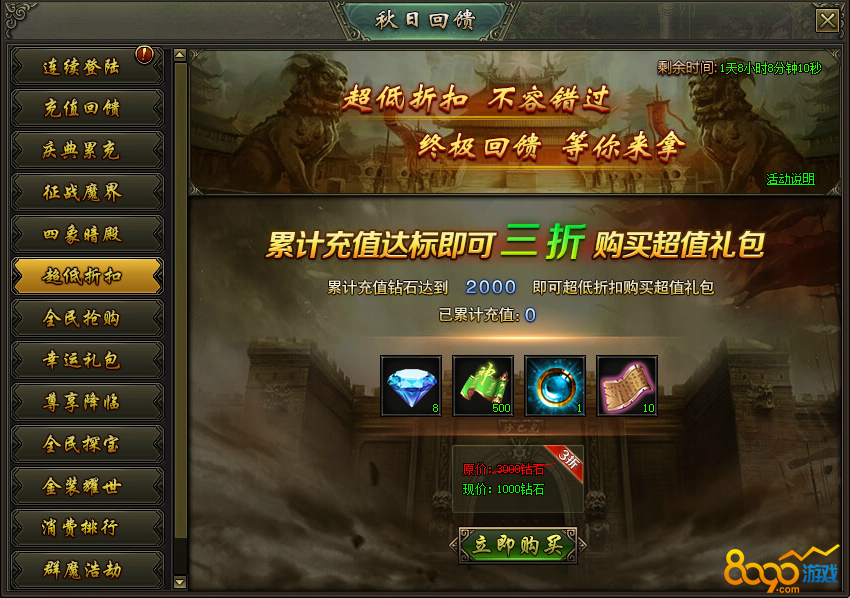 活动说明:活动期间,玩家累计充值达到指定额度即可超低价格购买礼包