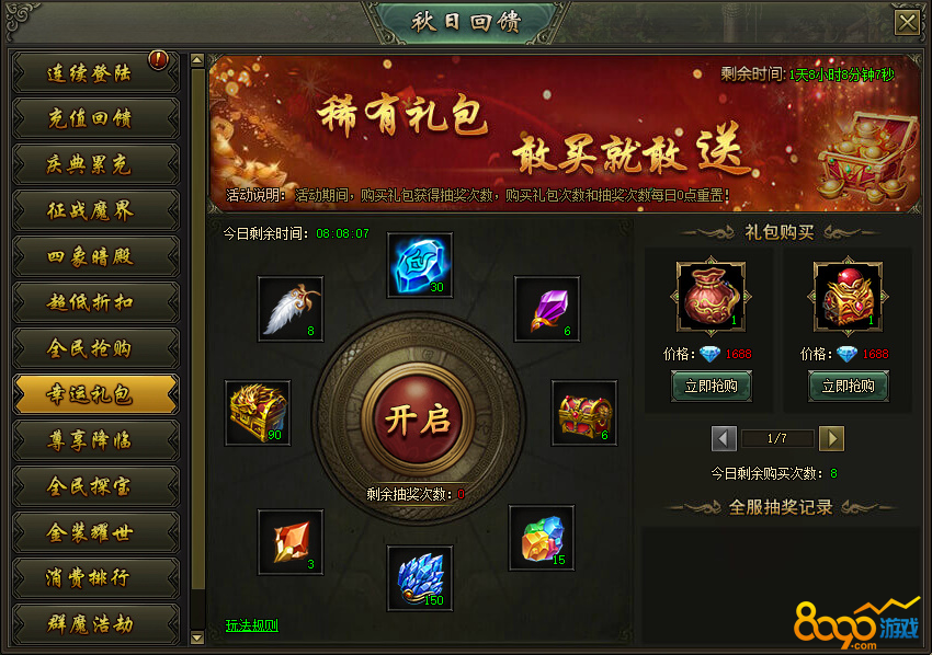 活动说明:活动期间,购买礼包获得抽奖次数,购买礼包次数和抽奖次数每日0点重置