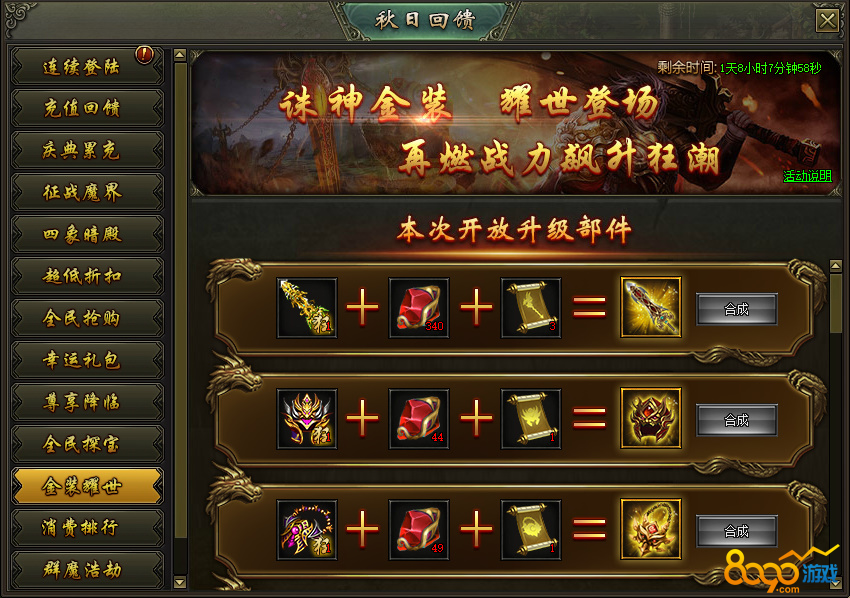 活动说明:活动期间,诛神金装耀世登场,穿戴之后战力飙升