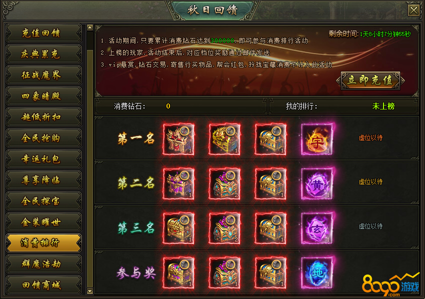 活动说明:活动期间,累计消费达到300000钻石的玩家参与排行,上榜的玩家奖励在活动结束后以邮件的方式进行发放