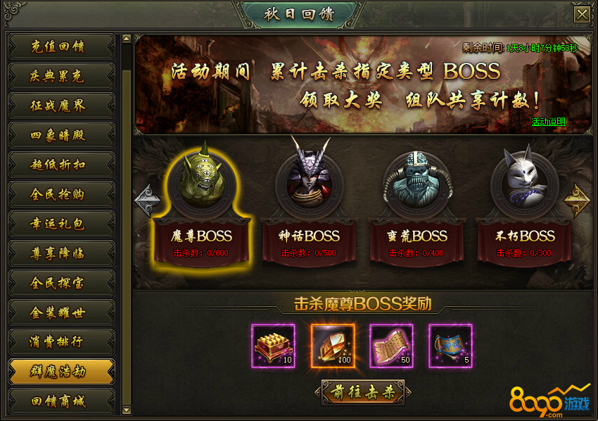 活动说明:活动期间,累计击杀指定类型BOSS,可领取超值奖励!