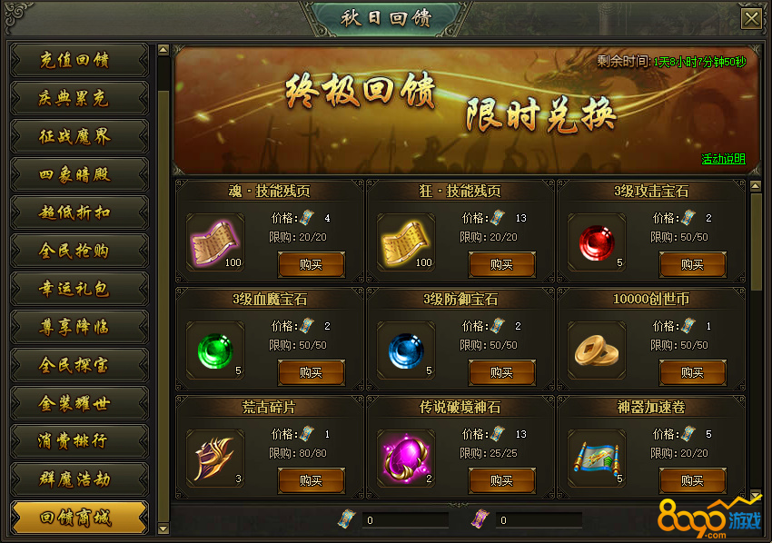 活动说明:活动期间,可使用充值回馈卷和消费回馈卷兑换大量奖励