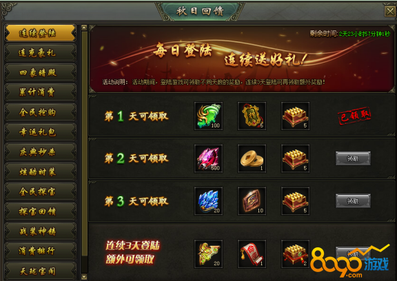 活动说明:活动期间,每天登陆游戏即可领取奖励,连续3天登陆更可获得额外奖励