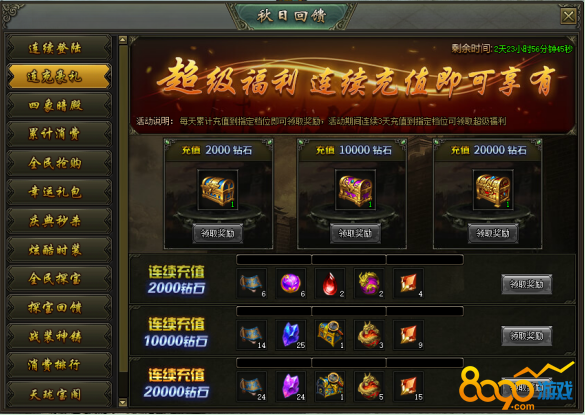 活动说明:活动期间,每天累计充值到指定档位即可领取奖励,连续3天充值到指定档位即可领取超级奖励