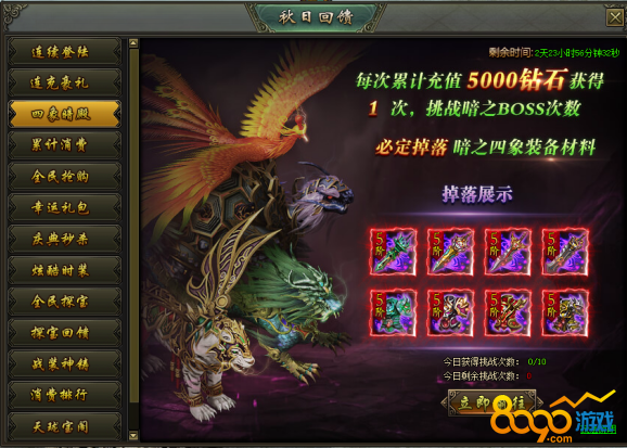 活动说明:活动期间每累计充值5000钻石即可获得1次四象暗殿挑战次数,必定掉落暗之四象装备