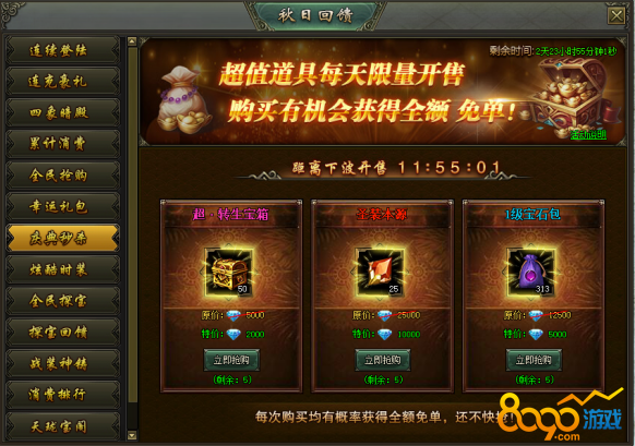 活动说明:超值道具每天限量开售,购买就有机会获得全额免单