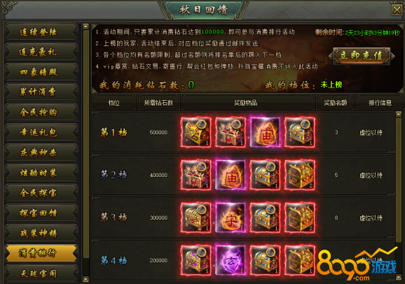 活动说明:活动期间,累计消费达到100000钻石的玩家参与排行,达到对应档位的玩家奖励在活动结束后以邮件的方式进行发放