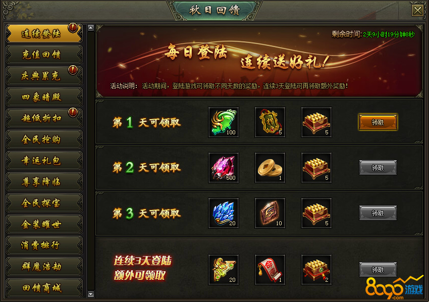 活动说明:活动期间,每天登陆游戏即可领取奖励,连续3天登陆更可获得额外奖励