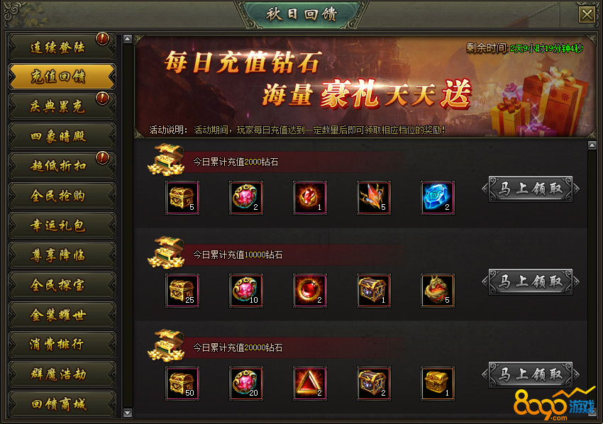 活动说明:活动期间,每日充值达到指定额度,即可领取超值豪礼,每种档位可领取1次