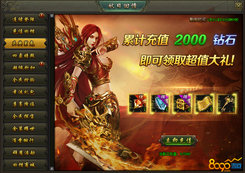 活动说明:活动期间,累计充值指定额度即可领取超值大礼!