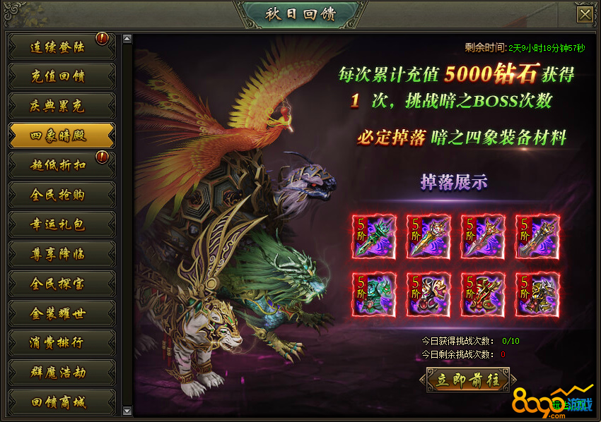 活动说明:活动期间每累计充值5000钻石即可获得1次四象暗殿挑战次数,必定掉落暗之四象装备