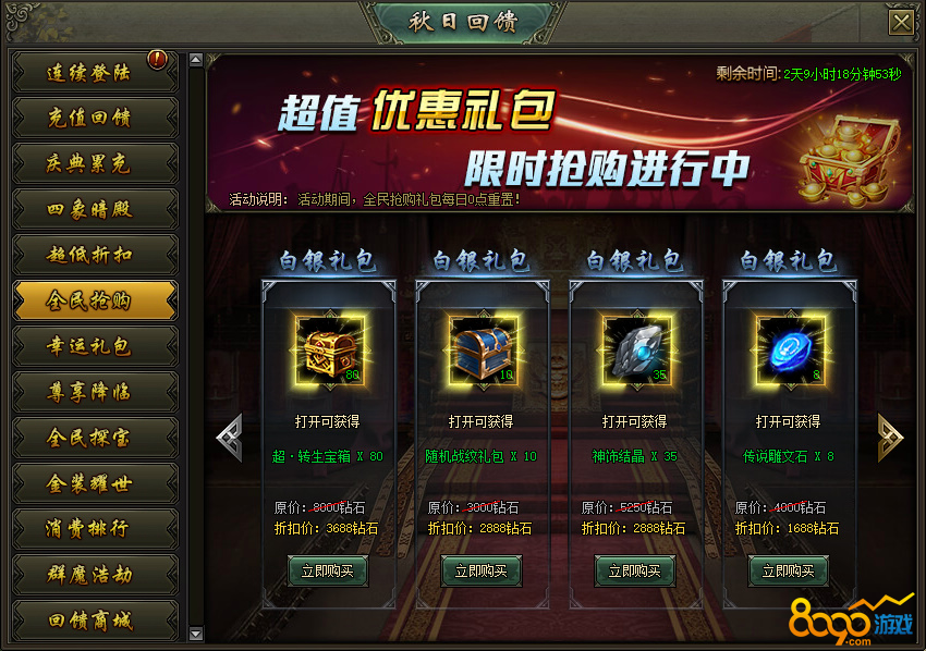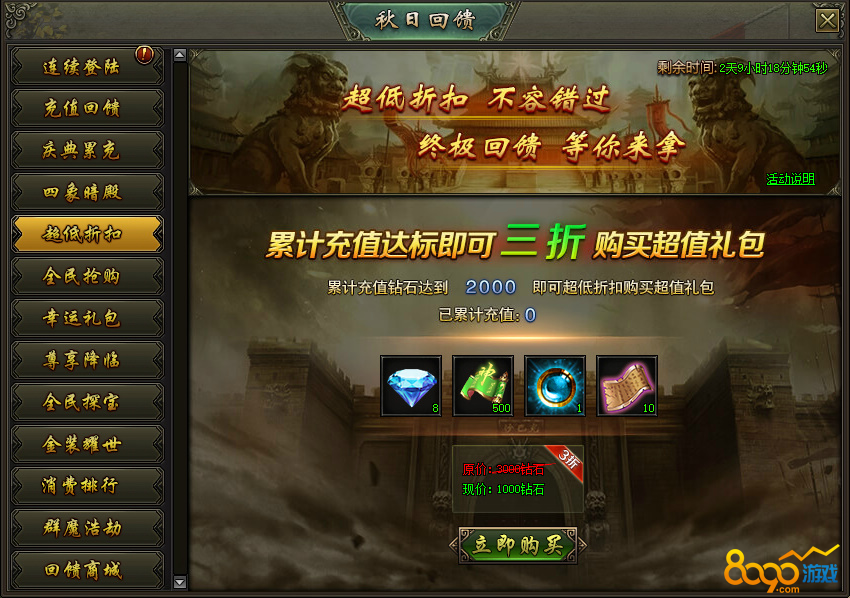 活动说明:活动期间,玩家累计充值达到指定额度即可超低价格购买礼包