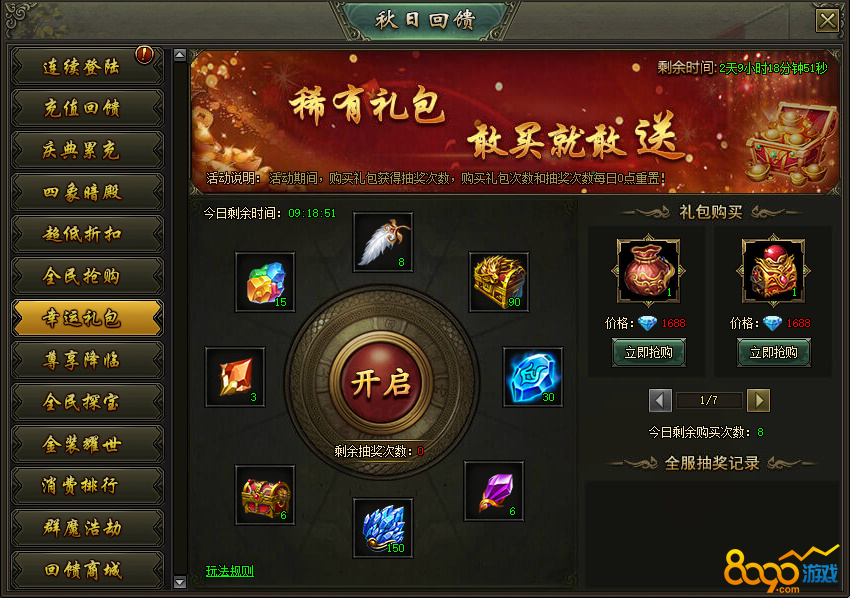 活动说明:活动期间,购买礼包获得抽奖次数,购买礼包次数和抽奖次数每日0点重置