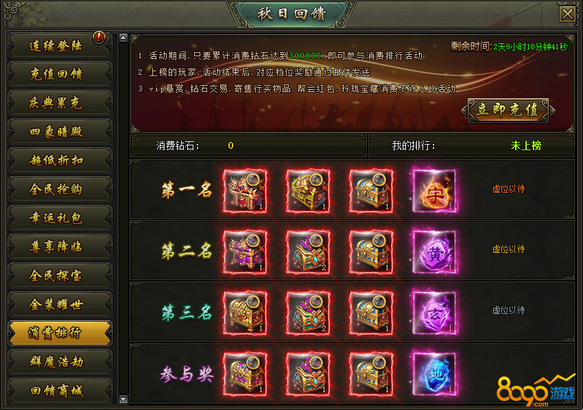 活动说明:活动期间,累计消费达到300000钻石的玩家参与排行,上榜的玩家奖励在活动结束后以邮件的方式进行发放