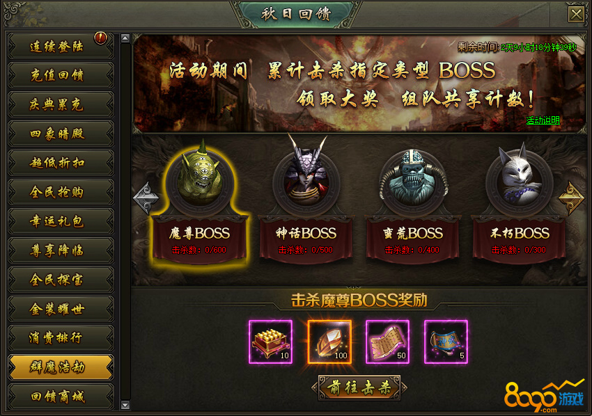 活动说明:活动期间,累计击杀指定类型BOSS,可领取超值奖励!