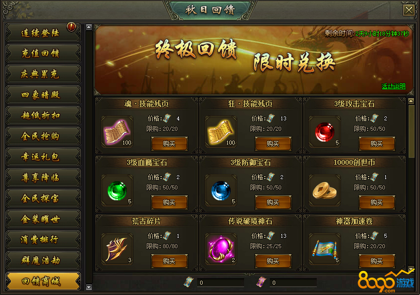 活动说明:活动期间,可使用充值回馈卷和消费回馈卷兑换大量奖励
