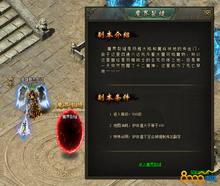 (1)全新玩法地图魔界裂缝开启,达到500级可从封魔古都89,80处的魔界裂缝入口进入