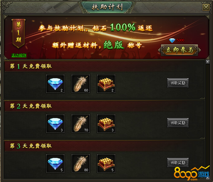 (2)可消耗一定钻石参与扶助计划,按照天数消耗钻石将全额返还,并额外获得材料奖励