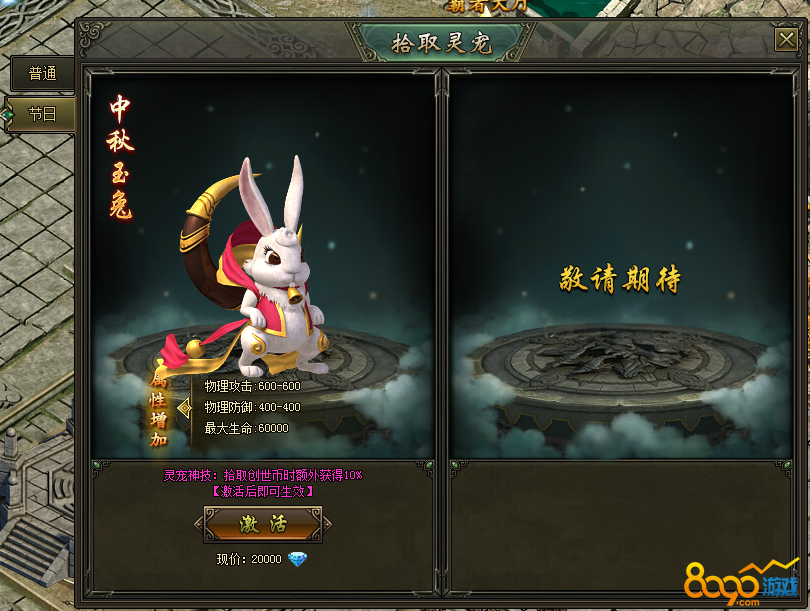 (2)开放中秋节灵宠—中秋玉兔,购买后可获得大量属性加成,并可激活拾取创世币额外增加10%的特殊效果