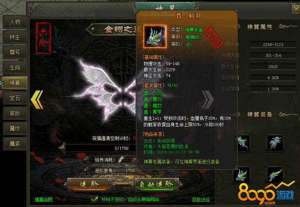 (4)穿戴4件神翼装备可激活被动技能“重生”:血量低于20%时,受到攻击可概率瞬间恢复自身生命上限一定%的生命值