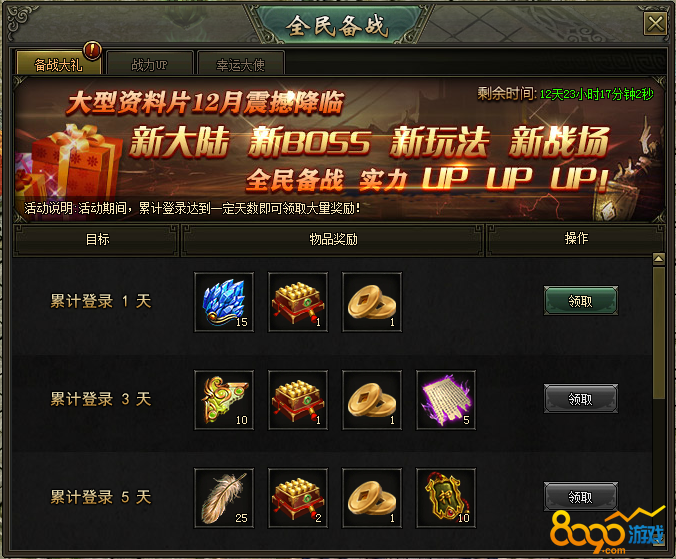 (1)备战大礼:活动期间,累计登陆达到指定天数,即可免费领取大量奖励