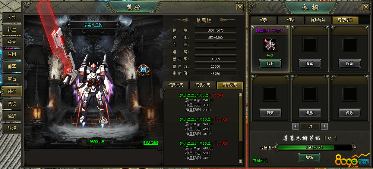 (4) 尊享收集:收集尊享时装达到一定件数,可激活套装效果,获得大量属性加成