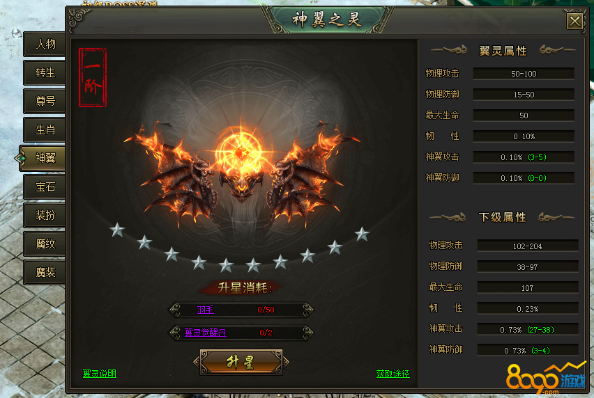 (3)翼灵可提升等阶上限受到神翼等阶限制,不可超过神翼等阶