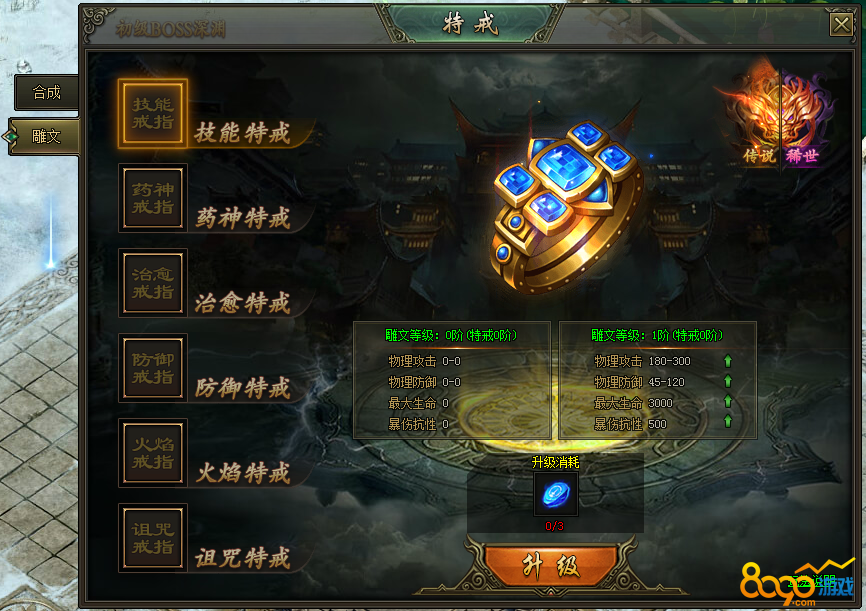 (3)每个特戒的雕文需单独进行升级,升级消耗传说雕文石、稀世雕文石