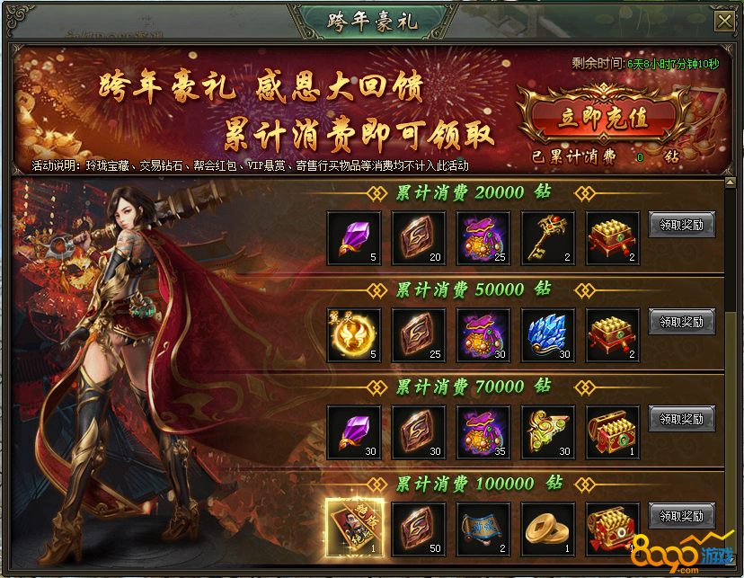 (2)活动期间,累计消费钻石达到指定额度,即可领取豪礼,可以获得神饰本源、翼灵觉醒丹、全新灵宠等稀有奖励