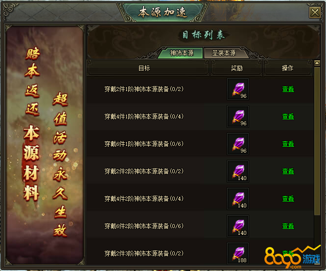 (2) 功能开启后,累计穿戴圣装本源装备、神饰本源装备达到指定目标,即可领取对应本源材料返还,每个奖励只可领取1次