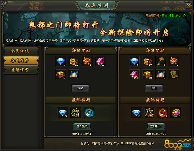 (2) 活动内容:活动期间,消耗钻石参与投资,即可连续15天每天领取投资奖励,第15天可领取终极奖励;当日未领奖励以邮件发放