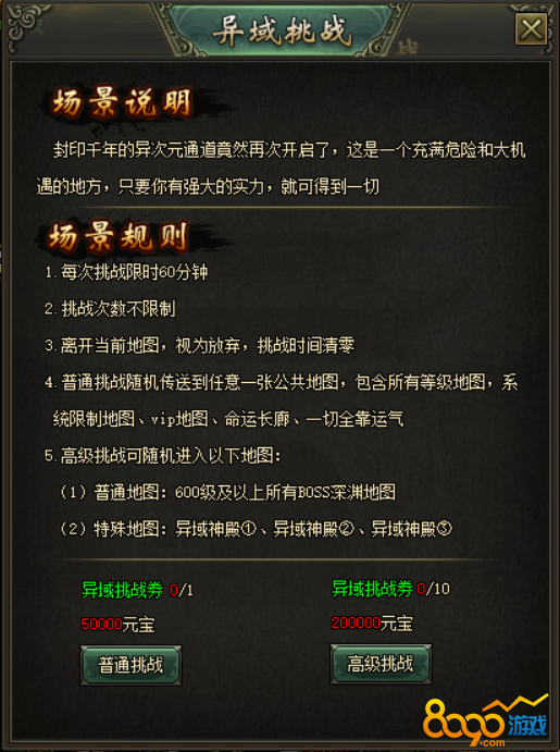 (2)高级挑战参与条件:600级以上玩家,每次消耗异域挑战券x10、元宝20万