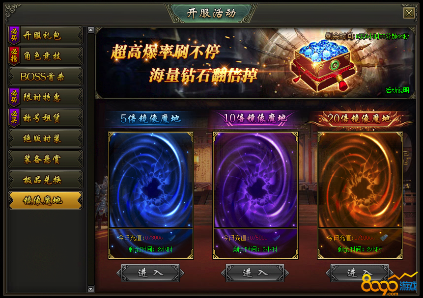 (2)活动期间,当日累计充值达到指定额度,可进入对应的5倍、10倍、20倍爆率的镜像魔地