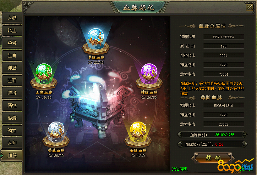 (3)血脉可分别进行炼化培养,高阶血脉需低阶血脉达到指定等级开启