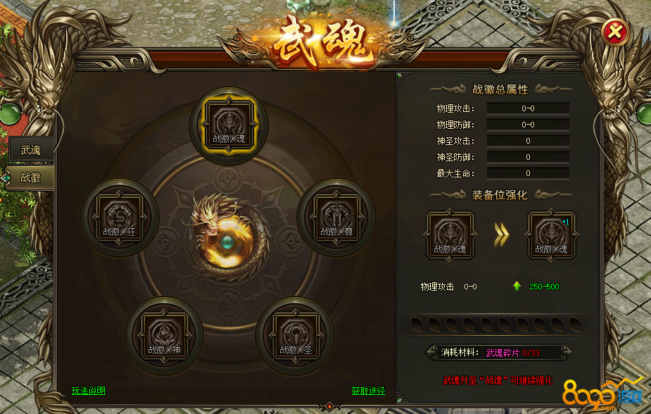(2)战徽分为战徽✗魂、战徽✗狂、战徽✗尊、战徽✗神、战徽✗圣5个部位,每个部位可穿戴对应的战徽装备增加大量属性