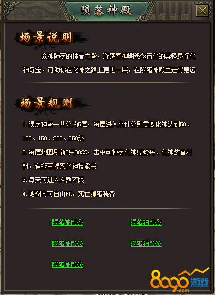 (2)陨落神殿分为5层,每层地图刷新5只BOSS,击杀概率掉落化神经验丹、化神装备材料、化神技能书