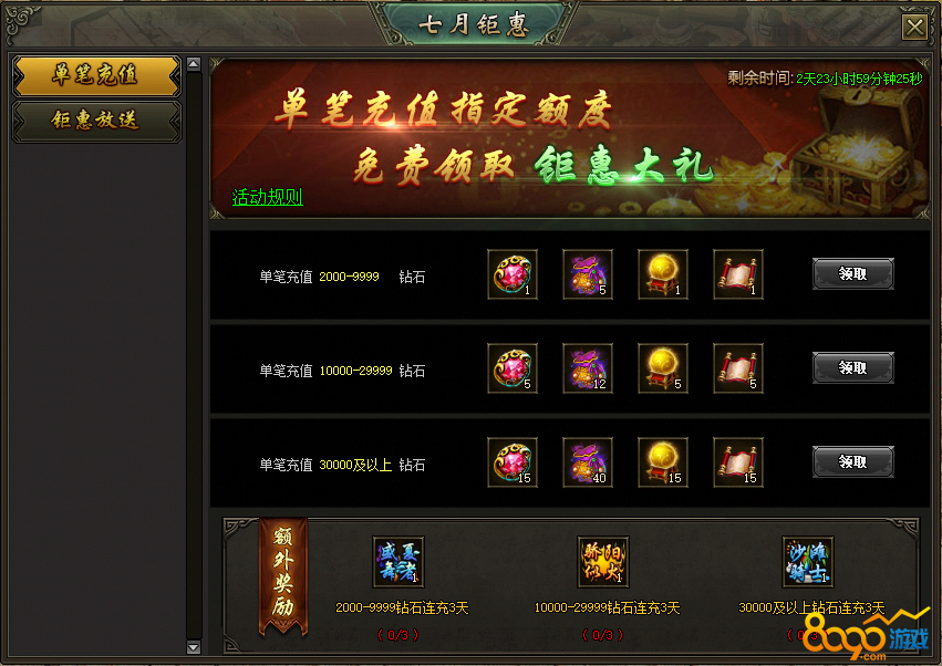 1)单笔充值:活动期间,单笔充值达到指定额度可领取对应的奖励,累计充值3天可额外领取绝版称号